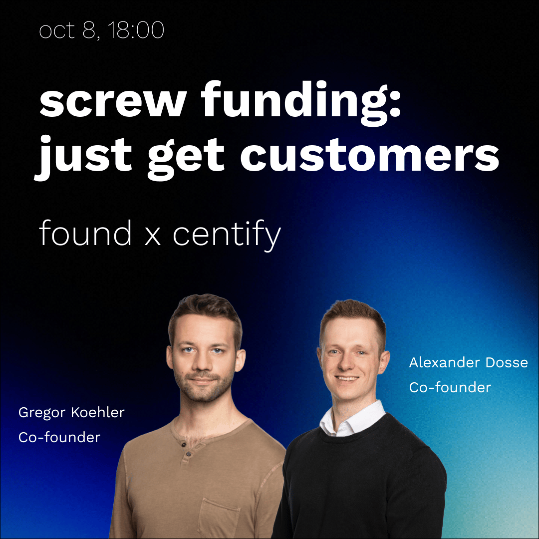 On October 8, we're inviting Alex and Gregor, founders of Centify, to share their playbook on bootstrapping a B2B startup while landing customers with the caliber of 1KOMMA5°, Mango Partners, and Mateo. They'll break down exactly how they built sustainable revenue without giving up equity.